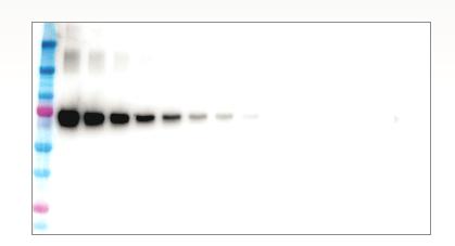 純化的轉鐵蛋白經過一系列的稀釋從500pg-61fg,使用SDS-PAGE電泳進行分離,蛋白分離后使用Azure轉印buffer轉印到低熒光背景膜上,進行封閉,孵育 chicken-anti-transferrin 的一抗,漂洗,孵育goat-anti-chicken HRP 的二抗;所有的稀釋液使用Azure Chemi Blot Blocking
