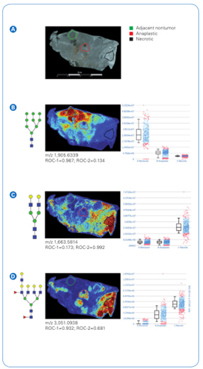 Figure 3. Quantification of N-glycan signatures from regional areas on tissue. Statistical testing was donecomparing nontumor adjacent and anaplastic regions (ROC-1) or anaplastic versus necrotic (ROC-2).A Photomicrograph depicting areas selected for measuring relative abundance of N-glycan expression.B A high mannose (Man9) structure distinguishing nontumor adjacent compared to anaplastic tumor ornecrotic regions. C A biantennary N-glycan defining necrotic regions with low expression in nontumoradjacent and anaplastic. D A tetrantennary fucosylated structure with low expression in adjacent nontumor and increasing expression in anaplastic and necrotic tissues regions.