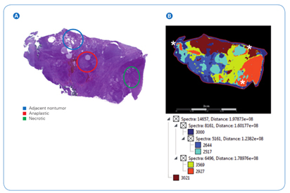 Figure 2. Image segmentation showing complexity of N-glycan signatures in a thyroid cancer tissuesection. A Pathologist marked H&E stain of section highlighting adjacent nontumor, anaplastic, and necrotic regions. B SCiLS image segmentation of N-glycans from 2D mapping. White asterisks markcalculated overlaps of anaplastic and necrotic regions.