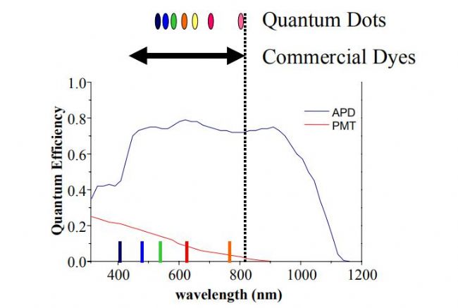 圖2.Quantum efficiency of the APD and PMT detectors. The bars on the lower axis indicate the typical excitation wavelengths at 405 nm, 488 nm, 532 nm, 632 nm, and 785 nm. The range of emission wavelengths of commercial dyes and the emission peaks of the quantum dots are shown at the top of the figure.