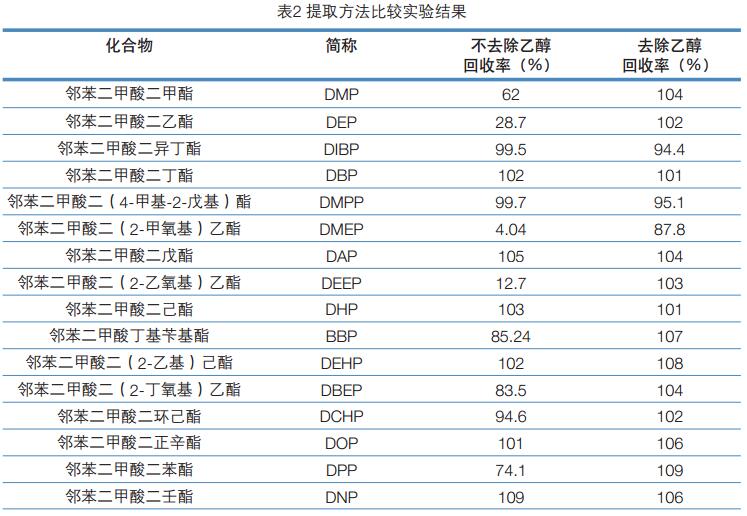 白酒中含有30~60%vol的乙醇,由于乙醇對鄰苯二甲酸酯類化合物的溶解性很好,因此在使用正己烷溶劑萃取白酒中的鄰苯二甲酸酯類化合物時,效果較差。采用先除去酒中乙醇后再用正己烷提取分析測定可避免乙醇帶來的誤差。準確量取5.0 mL白酒樣品,添加水平為0.80 mg/L,平行3次,采用去除乙醇和不去除乙醇兩種提取方法做樣品加標回收實驗,添加回收實驗結果見表2。實驗結果表明,采用去除乙醇提取法的樣品添加回收實驗具有較好的回收率。