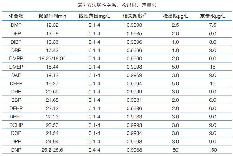 配置系列濃度0.10、 0.20、 0.40、 0.80、 1.00、2.00、 4.00 mg/L的混合標準溶液,由低濃度至高濃度依次進樣檢測,以質量濃度與峰面積作標準曲線線性回歸。結果表明,在0.10~4.00 mg/L范圍內15種鄰苯二甲酸酯類物質顯良好線性關系。 DNP響應較差,線性范圍為0.40~4.00 mg/L。采用樣品添加目標化合物的方法,依據特征離子質量色譜峰信噪比R S/N=3計算方法檢出限,R S/N=10計算方法定量限,結果見表3。