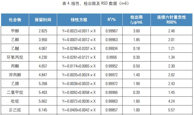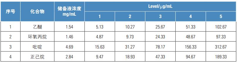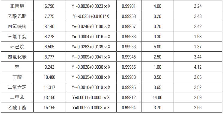 配制濃度水平:level1-5水平的校準溶液,采用上述方法分別進樣分析,考察各組分在該濃度范圍內的線性。實驗結果表明21種組分在該范圍內線性關系良好,線性相關系數(shù)均大于0.99(見表4)。