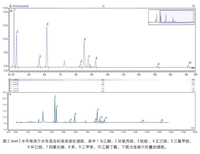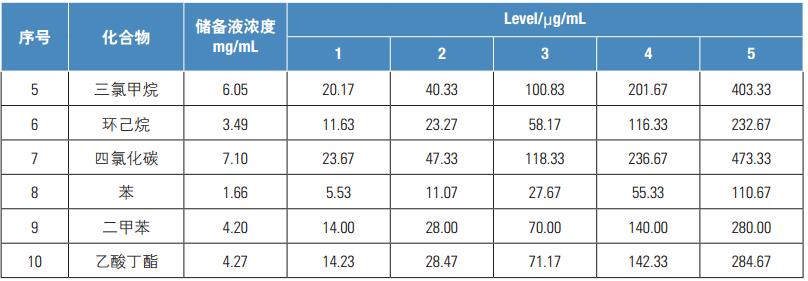 對藥品添加混合標準溶液(加標濃度水平level1、level2),考察21種溶劑殘留的加標回收情況。實驗結果表明各組分的加標回收率均在83-100%之間,符合日常分析檢測的要求。對level1、level2加標水平平行測定6次,平均RSD值在2.4-8.7%,符合穩(wěn)定性要求。同時以三倍信噪比計算各組分檢出限,各組分檢出限在0.2-14μg/mL之間。