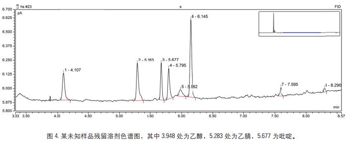 利用建立的分析方法,測試某未知藥品。實驗結果表明:本方法能夠測定藥品中的溶劑殘留,另外對于某些藥品含有基質較復雜,建議將最后程序升溫的溫度選擇在較高水平,以保證沒有對色譜柱的污染。