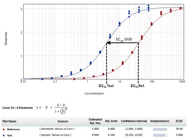 由于根據(jù)實際實驗中的數(shù)據(jù),很難獲得完全平行的擬合曲線,尤其對于非線性擬合回歸,而計算非平行曲線獲得相對活性是很困難的。在效應比較法中,參考品和測試品的曲線會使用約束模型同時進行擬合,在這個模型中,曲線被強制變?yōu)槠叫;而在非約束模型中,兩條曲線會各自進行擬合。通過統(tǒng)計學的方法,來比較約束模型和非約束模型兩種擬合度的差異,這個差異可能是由于非平行性造成的。