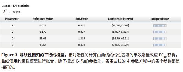 在約束模型中,用來描述曲線的所有參數(shù)都是一樣的,除了用來描述 X- 值的參數(shù)不一樣;線性擬合中,X- 值是指截距,非線性擬合中是指上、下漸近線之間的中值,也就是 EC50 值。SoftMax Pro 軟件具有計算線性擬合的相對活性,也可以使用約束性模型 ( 全局擬合模型 ) 和獨立模型對非線性擬合曲線進行評價和計算相對活性。