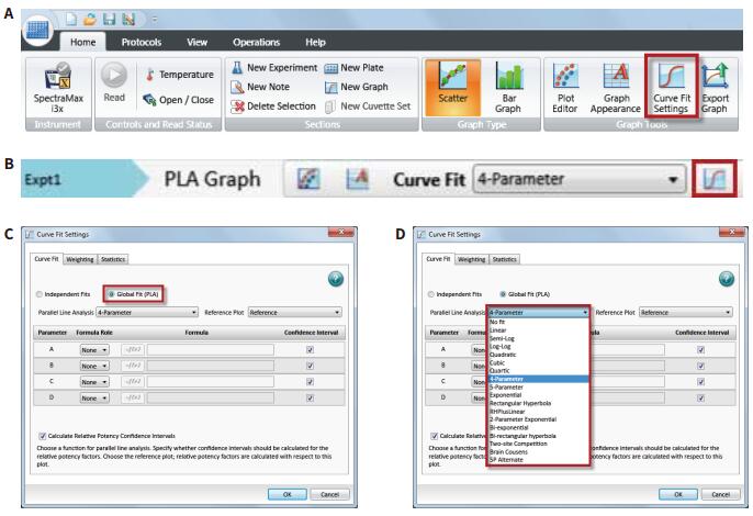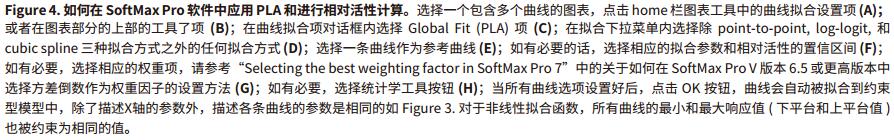 在 SoftMax Pro 7 軟件中,PLA 可以在除了“point-to-point”,“l(fā)og-logit”和“cubic spline”三種擬合方式之外的所有通用曲線擬合方式下使用。在圖表部分,所有曲線具有一個共同的曲線擬合方程,PLA 的具體使用設(shè)置請見 Figure 4。