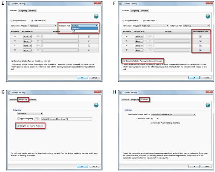 在軟件的模板中,權(quán)重因子的設(shè)置使用方差的倒數(shù),但是根據(jù)情況可以調(diào)整為更合適的權(quán)重公式。另外,在 SoftMax Pro 6.5或更高版本中,可以直接進行方差的倒數(shù)權(quán)重項的設(shè)置 (Figure 4G)。卡方檢驗方法中,參數(shù)的置信區(qū)間設(shè)置項 (Figure 4H) 只有在‘Weights are Inverse Variances’項被選擇的情況下才能使用。最佳的權(quán)重因子的設(shè)置會保證結(jié)果是主要來源于所有變化的數(shù)據(jù)點。