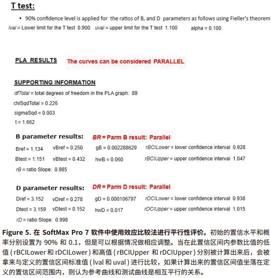 對于線性擬合曲線,該測試會針對參考曲線和測試曲線的斜率值進行,也即 SoftMaxPro 軟件中所描述的曲線方程內(nèi)的 B 參數(shù)值?墒,對于非線性擬合曲線,此方法只測試上平臺和斜率值,下平臺則由于菲勒定理的數(shù)學局限而不做測試。在低濃度時,參數(shù)的變異會非常高,導致中間計算過程會產(chǎn)生虛數(shù),進而導致最終計算的置信區(qū)間不正確或無法計算。這個問題被美國農(nóng)業(yè)部 (USDA) 的獸用生物制品中心建議將下平臺值固定為 0,然后使用上平臺和斜率值來進行測試。相同地,SoftMax Pro 軟件的 Parallelism Test 的模板內(nèi),默認將下平臺值設(shè)為 0,然后對斜率( 參數(shù)B ) 和作為上平臺的參數(shù) A 或 D 進行平行性結(jié)論的判斷。