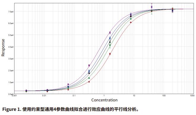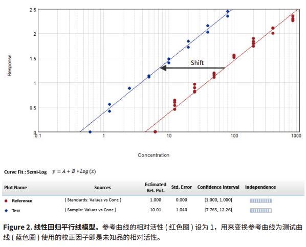 在生物實驗中要經(jīng)常要使用到的平行線分析(PLA)方法,當無法直接檢測一個生物制品的活性而只能通過檢測其產(chǎn)生的效果時,PLA方法通常會被用來進行效應曲線的比較來獲得此制品的效果(Figure1)。如果對于兩種物質(zhì)其生物響應相似或者在兩種不同的生物環(huán)境中同一種物質(zhì)產(chǎn)生相似的效應曲線時,平行線分析法可以被用來進行評價。評價平行性是計算化合物或藥物相對活性的前提,并且在很多生物應用中如藥物活性比較、分析物鑒定、交叉反應、干擾物質(zhì)、基質(zhì)補償、濃度估算和抑制效應等應用研究中。