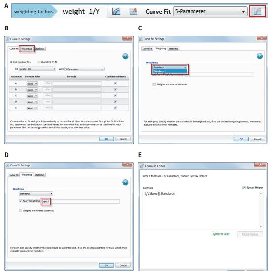 默認(rèn)情況下,SoftMax Pro® 7 軟件對(duì)曲線擬合不進(jìn)行加權(quán)運(yùn)算。這被稱為固定權(quán)重,其中加權(quán)因子被設(shè)置為曲線擬合的所有數(shù)據(jù)點(diǎn)的一個(gè)。如圖 2 所示,也可以進(jìn)行整體擬合和單條曲線擬合加權(quán)運(yùn)算。