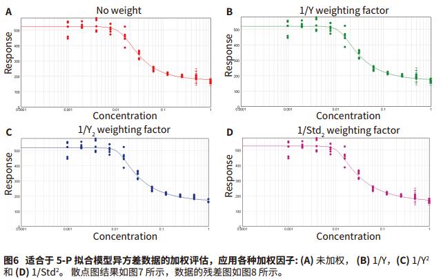 如前一篇應(yīng)用文章中所討論的,“如何在SoftMax Pro 軟件中選擇最佳的曲線擬合方式”,最佳的擬合,在曲線擬合上應(yīng)用最佳加權(quán)方式,可以使用 (SSE) 和AKAIKE(AIC) 的方法來測(cè)量用于檢測(cè)曲線擬合的平方和誤差。模板標(biāo)題 “ SoftMax Pro 加權(quán)因子測(cè)試”應(yīng)用最主流的加權(quán)因子方式開發(fā)和實(shí)施的計(jì)算方式:1/Y,1/Y2 和 1/Std2可以使用 SSE 和 AIC 方法進(jìn)行相應(yīng)測(cè)試比較。這個(gè)模板文件可以在我們官網(wǎng)上直接下載,如 。圖3 所示,顯示了一個(gè)不需要任何加權(quán)的同方差數(shù)據(jù)的例子,因?yàn)槠鋽?shù)據(jù)的離散非常小。數(shù)據(jù)使用 5-P 曲線擬合方式并應(yīng)用各種加權(quán)因子方式,如 未加權(quán) ( 圖3A ), 1/Y ( 圖3B ), 1/Y2 ( 圖3C ),和 1/Std2 ( 圖3D )。下一個(gè)例子舉異方差數(shù)據(jù)的情況 ( 圖6-8 )。這里,標(biāo)準(zhǔn)偏差隨著響應(yīng)的增加而增加,并產(chǎn)生散射 ( 圖7A )。數(shù)據(jù)進(jìn)行 5-P 擬合方式并嘗試各種加權(quán)因子方式,不擬合 ( 圖6A ), 1/Y ( 圖6B ),1/Y2 ( 圖6C ) 和 1/Std2( 圖6D )。圖7 中總結(jié)了結(jié)果,并表明1/Y2因子方式是數(shù)據(jù)集最佳擬合加權(quán)方式。