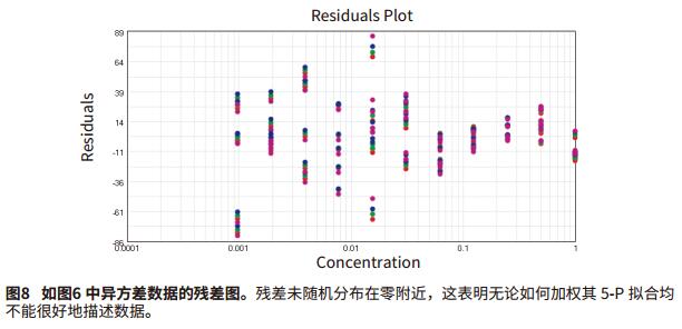當(dāng)具有足夠數(shù)量的數(shù)據(jù)時(shí),基于方法開發(fā)或方法驗(yàn)證獲得最佳曲線擬合方式后,隨后進(jìn)行曲線加權(quán)和選擇合適加權(quán)因子對(duì)曲線進(jìn)行處理。所有曲線擬合模型中,X ( 通常為濃度 ) 是自變量和 Y ( 通常為響應(yīng)值 )是因變量。對(duì)于同方差數(shù)據(jù),所有樣品濃度標(biāo)準(zhǔn)偏差是相同的。最佳擬合方式為不使用加權(quán)因子進(jìn)行權(quán)重?cái)M合。然而,加權(quán)重針對(duì)異方差權(quán)變得非常有意義,就是隨著樣品濃度增加標(biāo)準(zhǔn)偏差也會(huì)增加,如圖1 所示。一些曲線擬合,如四參數(shù)和五參數(shù)曲線擬合,降低數(shù)據(jù)點(diǎn)和曲線之間的垂直誤差 。