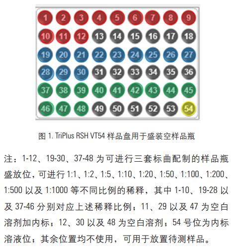 系列濃度有機磷農殘標樣的配制: 取 5 ml 1.0 ppm 的 14 種種有機磷農殘混標加入到 10ml 的溶劑瓶中, 置于 TriplusRSH 三合一自動進樣品臺標準清洗位的 4 號位; 將 10ml空白煙草提取液加入到 10ml 溶劑瓶中置于 Triplus RSH 三合一自動進樣品臺標準清洗位的 1 號位, 用做稀釋溶劑;在 Triplus RSH 大體積清洗位上的兩個溶劑瓶中分別加入適量的乙酸乙酯丙酮混合溶劑用于洗針。 在樣品盤上放置空樣品瓶(位置如下圖,圖1的2、3、4、5、6號位),直接調用內置自動稀釋文件,即可自動配制系列標準溶液(濃度分別為20ppb、50ppb、100ppb、200ppb和500ppb)。