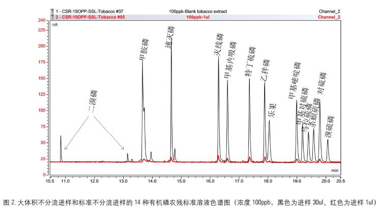 圖 3 為濃度為采用兩種不同溶劑配制的 14 種有機磷農殘標樣的色譜圖, 濃度均為 100 ppb, 采用大體積進樣, 進樣量 30ul。 其中采用以空白煙草提取液配制的標樣色譜圖和由乙酸乙酯丙酮混合溶劑配制的標樣色譜圖分別以紅色和藍色標記。 從這兩種不同溶劑配制的 14 種有機磷農殘標樣的色譜圖可以看出, 以煙草基質提取液配制的標樣相比于由乙酸乙酯丙酮混合溶劑配制的標樣, 各有機磷的峰形以及靈敏度有了明顯的改善, 特別是甲胺磷、樂果以及溴硫磷。 上述現象說明, 基質標樣能明顯改善目標物特別是有機磷的峰形以及靈敏度。 鑒于此, 后續均采用空白煙草基質提取液來配制系列有機磷農殘標樣,以消除基質效應的影響。