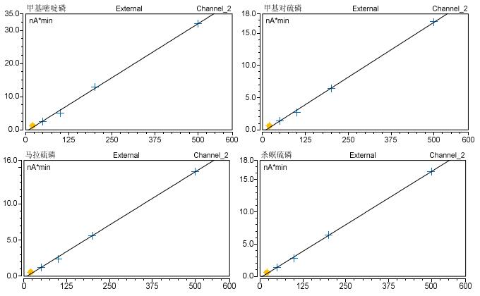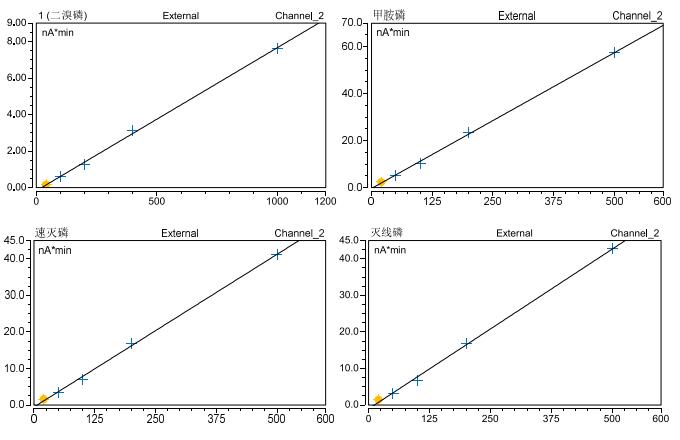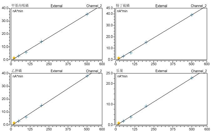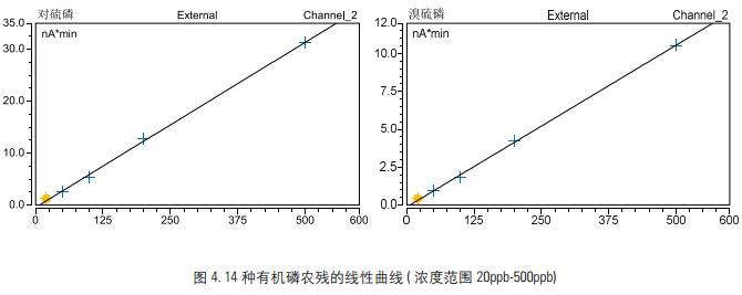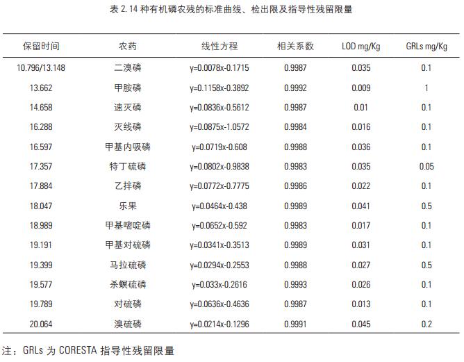 對于系列有機磷農殘標樣, 采用 Triplus RSH 自動配標曲功能進行配制, 各濃度分別為: 20ppb、 50ppb、 100ppb、200ppb 和 500ppb。 采用上述方法分別進樣分析, 考察在20ppb-500ppb 濃度范圍內的線性 , 計算得出 14 種有機磷農殘的線性方程及其相關系數 ; 以 3 倍信噪比計算其檢出限 , 結果見表 2。 實驗結果表明, 在設定的濃度范圍內 14種有機磷農殘在該濃度范圍內的響應與其濃度呈良好的線性關系 , 相關系數均大于 0.998(圖 4) , 且其檢出限均低于 CORESTA 指導性殘留限量 (GRLs)[8]。 這也同時表明了Triplus RSH 的高準確配標樣功能以及大體積不分流進樣的可靠性。