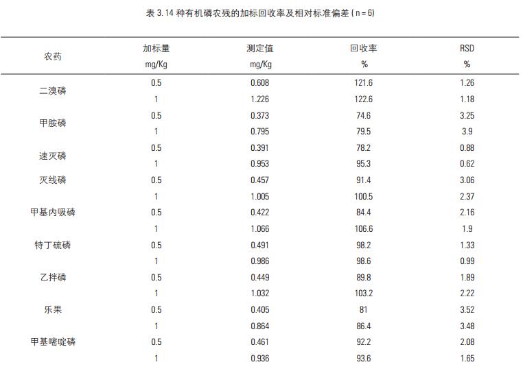 按照上述方法在不含待測有機磷農殘的煙葉樣品中加入0. 5 和 1.0 mg/Kg 的 14 種有機磷農殘標樣, 分別進行前處理和 GC-FPD 分析, 并按照加標量和實際測定量計算其回收率, 結果見表 3。 實驗結果表明, 在上述 2 個加標水平下, 14 種有機磷農殘除了二溴磷回收率大于 120%, 其它均在 75%-110% 之間, 且平行測定 6 次的相對標準偏差均低于 4%, 能夠很好地符合對農藥多殘留檢測的需求。