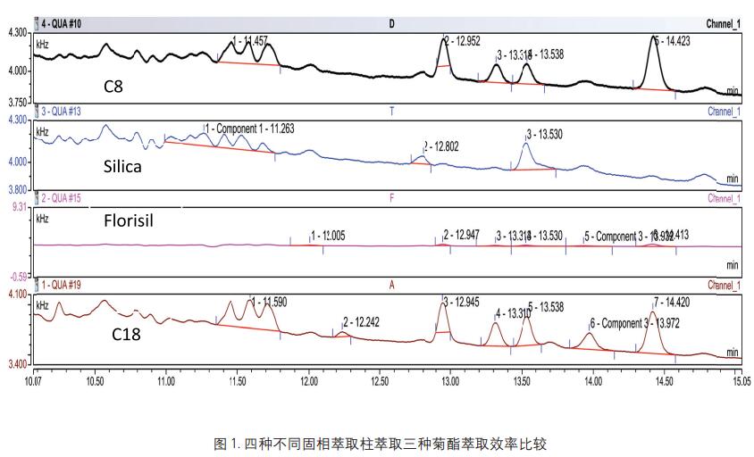 參考 GB 29705-2013 的要求, 對水產品中的菊酯進行分析。本方法中主要考察了不同固相萃取柱對水產品中菊酯的萃取能力, 實驗結果表明, C18 固相萃取柱的提取效果最好, 如下圖 1 為四種固相萃取柱對菊酯提取效果色譜圖。