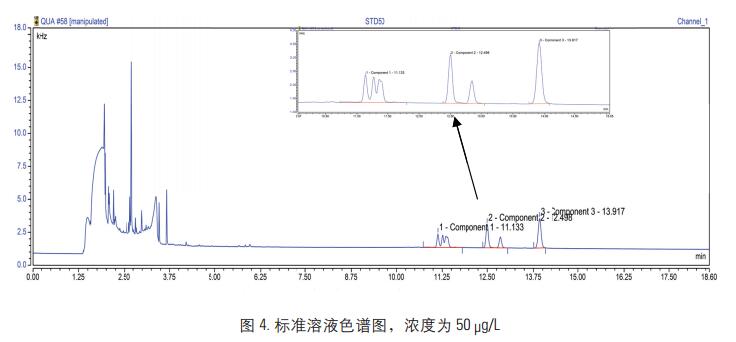 如圖為標準品及某樣品加標的色譜圖, 濃度為 10 μg/L。