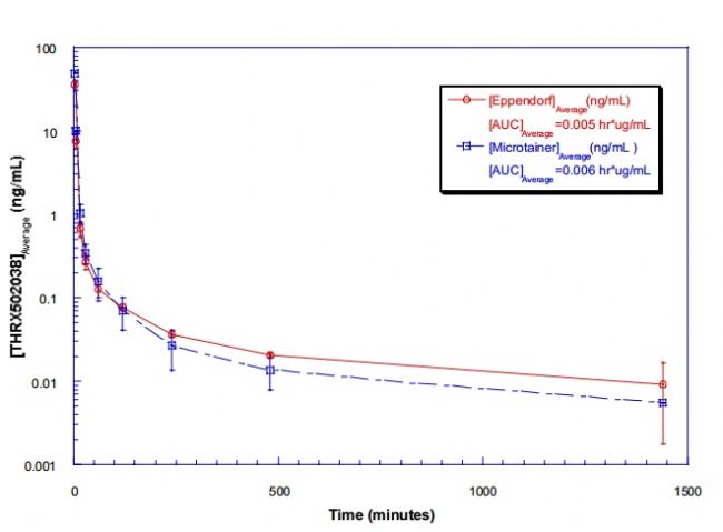 Figure 4. PK profile of THRX-502038 comparing plasma samples collected in microtainers versus samples collected in Eppendorfs.