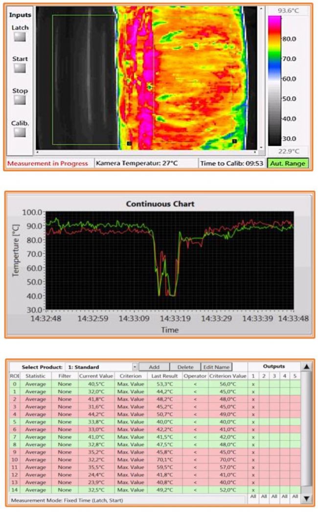 ThermoInspector系統在監測運行期間能直接在屏幕上顯示所有需要的數據和信息。從實時輻射流(最多4臺熱像儀),包括每個ROI(興趣區)的設置分析,到時間圖、溫度曲線和告知操作員的數字指示器。