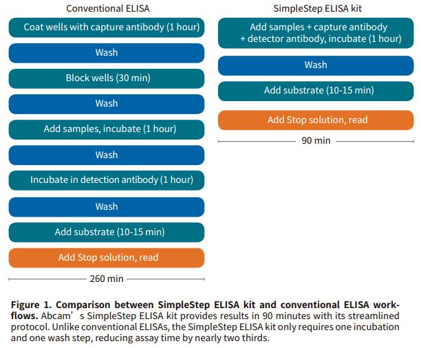 THP-1 是人外周血的單核細胞系,最初來源于急性單核細胞性白血病患者,常被用來體外研究巨噬細胞功能。 它通常屬于懸浮細胞,當用 PMA 處理后可分化為貼壁生長的巨噬細胞。THP-1 能釋放許多細胞因子,其中包括白細胞介素 -8(IL-8),一種能被許多類型細胞分泌的、在調節急性炎癥反應中發揮作用的細胞因子。IL-8 與許多分析物一樣可以在 96 孔板中被 ELISA 檢測定量。通常 ELISA 實驗需要耗費 4 個小時,而在 Abcam 的 SimpleStepELISA 試劑盒幫助下實驗時間可以縮短至90 分鐘,節約了近三分之二的時間,并且無損實驗的靈敏度和重復性 ( 圖1 )。這里我們介紹了如何使用 hIL-8 SimpleStepELISA 試劑盒以及如何在 SpectraMax ABSPlus 微孔板讀板機上使用 SoftMax Pro 軟件預置的便捷程序來測定 IL-8 的含量。