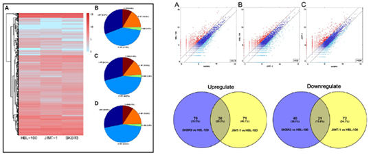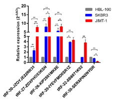 圖1. 高通量測序檢測在HBL-100,JIMT-1和SKBR3中差異表達的tRFs,經生信分析,