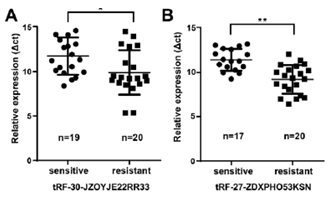 圖3. qPCR驗證敏感和耐藥病人血清來源的tRFs,結果顯示tRF-30-JZOYJE22RR33 和 tRF-27-ZDXPHO53KSN明顯下調