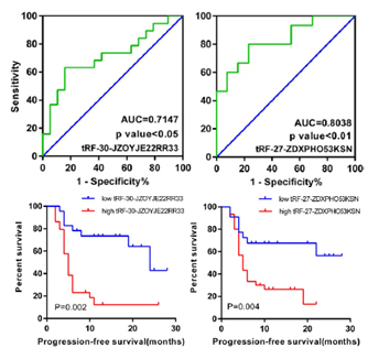 圖4. ROC曲線和無進展生存期曲線顯示tRF-30-JZOYJE22RR33 和 tRF-27-ZDXPHO53KSN