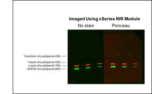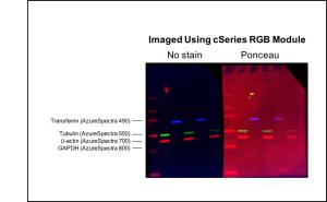 Azure Fluorescent Blot Blocking Buffer封閉兩半印跡膜,并使用如圖中標記的四種不同熒光探針檢測四種蛋白。使用Azure cSeries RGB模塊對印跡進行成像, 盡管徹底脫色,但在用麗春紅染色的一半印跡上看到非常高的熒光背景。