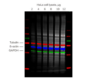 向凝膠中加入稀釋的HeLa細胞裂解物。轉印后,將印跡用AzureRed染色,然后在不脫色情況下加入tubulin,ß-actin和GAPDH探針。用Sapphire 雙模式多光譜激光成像系統掃描成像。四個通道進行疊加,總蛋白質(AzureRed染色)以灰色顯示;tubulin-紅色,ß-actin-藍色和GAPDH-綠色