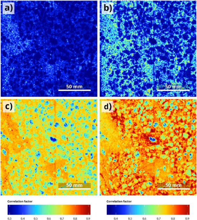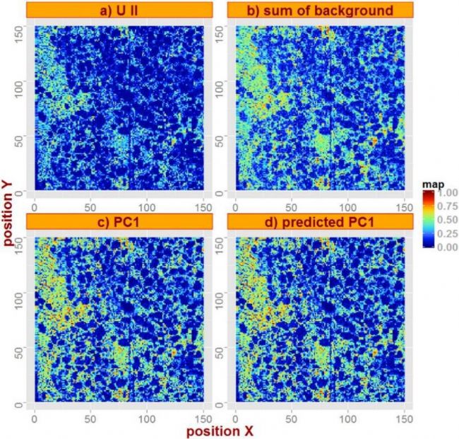 應用PCA算法,可對任何不均勻樣品LIBS測量譜線對應的未知成分進行分析。但是,此次測量生成22500 × 26000個譜線數據變量,便要從RAM中讀取33 GB的龐大數據,用以PCA算法進行處理,意味著巨大的計算量,耗時漫長。因此AtomTrace團隊運用AtomAnalyzer軟件中改善的PCA算法簡化運算過程和數據讀取方式,將分析工作量減少了85%,并獲得良好的分析效果。該方法此前未曾有人嘗試。