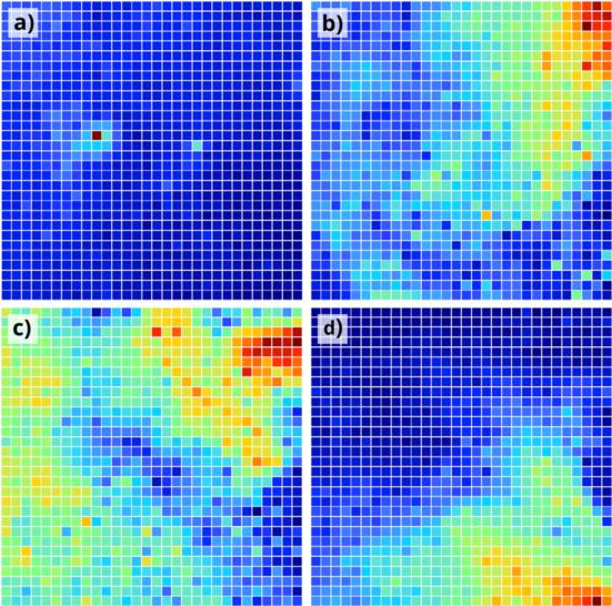c) PC1優化算法U II@409.01nm數值分布;d) PC1優化算法590-595nm 背景區域數值分布
