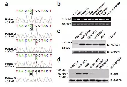 KLHL24突變位于起始密碼子區域,因而翻譯無法正常起始,猜測Met29可能作為另一翻譯起始位點。將攜帶正常KLHL24與KLHL24-∆N28質粒的轉染細胞分別裂解進行免疫印跡,均發現目的蛋白的對應條帶(KLHL24-∆N28; Fig. 1c)。