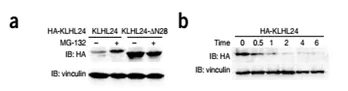 所有結果表明,突變體KLHL24-∆N28失去了自泛素化能力,從而提高了蛋白的穩定性及存在豐量。