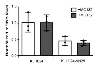 將KLHL24與KLHL24-∆N28在HaCaT(永生化人類角質細胞系)細胞中過量表達,發現KLHL24-∆N28的表達量遠遠高于正常型KLHL24 (Fig. 2a). 猜測可能是由于蛋白質的穩定性不同導致,因為mRNA水平與這種蛋白表達量的差異表現無關( Fig. 3)。