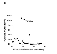 單獨表達KLHL24 Kelch結構域(Kelch結構域負責與底物結合)與GST融合蛋白,同時,為排除非特異性結合蛋白,以Kelch結構域突變體(Kelchmut)作為平行對照。將HaCaT細胞裂解液依次進行GST pulldown及質譜,確認了部分候選底物,初步質譜分析(Fig. 4c)表明,KRT14一枝獨秀,很可能是KLHL24的底物。