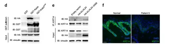 進一步與對照組對比分析,最終發現KRT14可與KLHL24,KLHL24-∆N28結合(Fig. 4c,d,e),而Kelchmut與KRT14的親和力明顯較低。