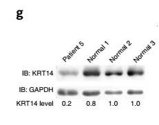 首先測定KRT14蛋白含量,結果表明2位患者皮膚樣品中的KRT14含量明顯低于年齡相當的非患病對照組(Fig. 4f,g)。同時,與KRT14形成異二聚體的Keratin 5 (KRT5)含量也較對照組低,但keratin 1 (KRT1)含量沒有發生變化(不與KRT14或 KRT5形成二聚體)。