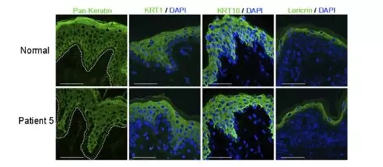 角蛋白免疫熒光及皮膚分化標志物表明,患者基底層細胞中角蛋白大量減少,但基底上層角蛋白及分化標志物豐度保持不變(Fig.5)