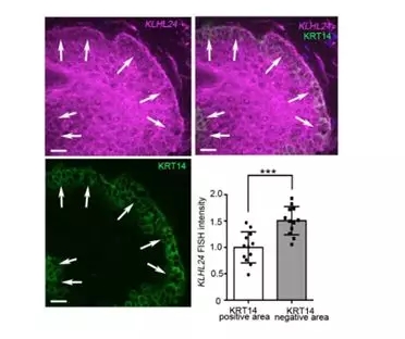 通過FISH,發現在正常和病人來源的皮膚樣本中,基底層角質細胞較基底上層角質細胞的KLHL24表達量更低,而KRT14的含量則與此相反(Fig. 6)。