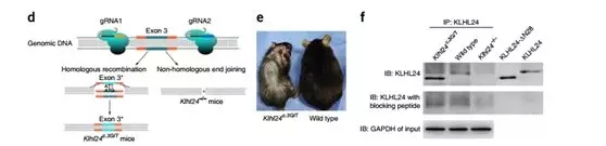 Fig7. (d) Illustration of the CRISPR/Cas9-mediated knock-in and knockout strategies. (e) Photograph of a 20-weekold Klhl24c.3G/T male mouse (left) and its wild-type male littermate (right). (f) Cerebral tissue extracts from a Klhl24c.3G/T mouse, its wild-type littermate and a Klhl24-/- mouse were immunoprecipitated with an antibody to KLHL24 followed by immunoblotting.