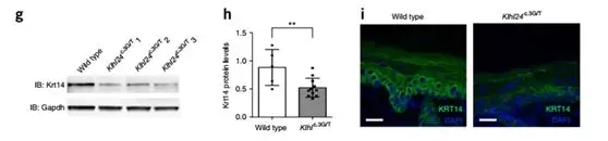 同時,Klhl24c.3G/T小鼠皮膚樣本中,Krt14含量較野生型降低(Fig. 7g–i),降低程度顯著但仍高于患者皮膚Krt14含量,此現象在一定程度上解釋了Klhl24c.3G/T小鼠為何沒有皮膚脆性表型。
