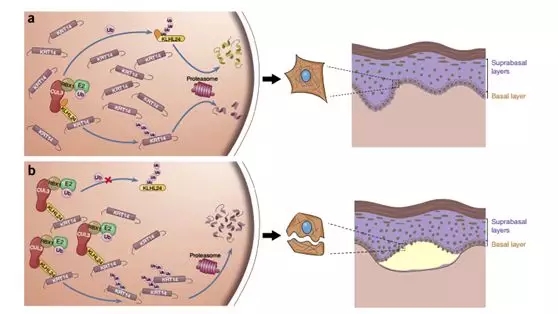 角朊細胞分化時, KLHL24的誘導表達及其對KRT14的泛素化修飾可能參與其中,而KLHL24的自泛素化可以防止KRT14的過度下降,從而提供了一層安全保障。