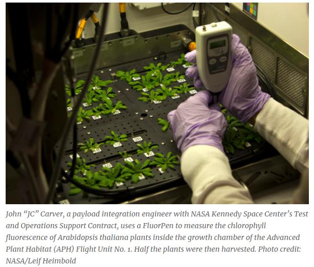 同時,為了檢測植物在太空中的生長狀況,NASA肯尼迪航天中心的工程師使用FluorPen葉綠素?zé)晒鈨x檢測培養(yǎng)器的擬南芥。