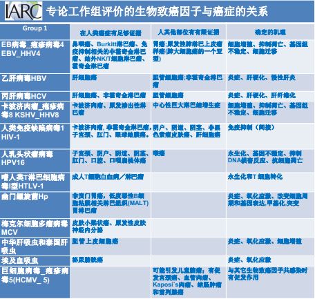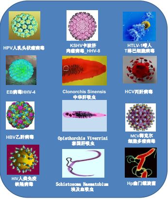 國際癌癥研究機構(IARC)2012年確認:有17.8-26%的癌癥是由下列一種人類病毒、 細菌或寄生蟲所引起, 包括: EB病毒、 乙肝病毒、 丙肝病毒、 卡波濟肉瘤皰疹病毒、 人類免疫缺陷病毒、人乳頭狀瘤病毒、 嗜人類T淋巴細胞病毒、 梅克爾細胞多瘤病毒、 中華肝吸蟲和泰國肝吸蟲、 埃及血吸蟲和幽門螺旋菌等。