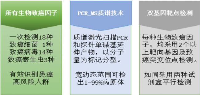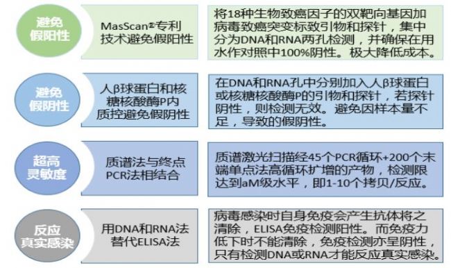 為了極早發現體內是否存在復雜的生物致癌因子感染,需要選擇超高靈敏度+超寬動態范圍的檢測方法。多重PCR+MALDI-TOF質譜聯用是開創無創產前診斷和液體活檢的頂級先進技術。用于生物致癌檢測,把不可能變得可能,就是MasScan的核心技術。