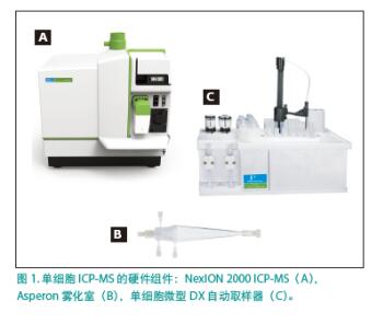 通過表1 所示條件,在NexION 2000 ICP-MS 上運(yùn)行Syngistix 軟件下的單細(xì)胞應(yīng)用模塊,完成所有樣品分析。圖1 顯示了用于SC-ICP-MS 分析的組件,包括NexION 2000 Asperon™ 霧化室以及專用的單細(xì)胞進(jìn)樣微型DX自動(dòng)取樣器。Asperon 霧化室旨在最大程度將細(xì)胞傳送到NexION,而單細(xì)胞微型DX 自動(dòng)取樣器則在分析前攪動(dòng)細(xì)胞懸濁液,以確保細(xì)胞不會(huì)從溶液中沉淀出來。