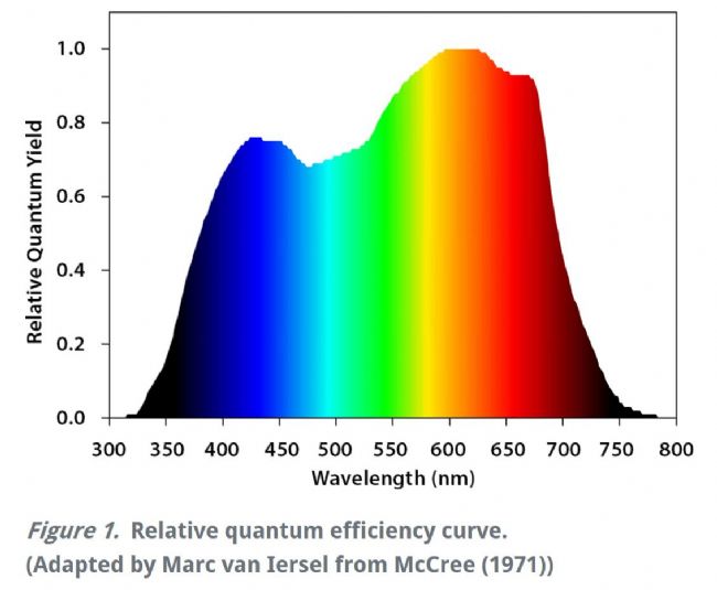 McCree, K.J. 1971. The Action Spectrum, Absorptance and Quantum Yield of Photosynthesis in Crop Plants. Agricultural Meteorology. 9(Supplement C):191-216. doi.org/10.1016/0002-1571(71)90022-7